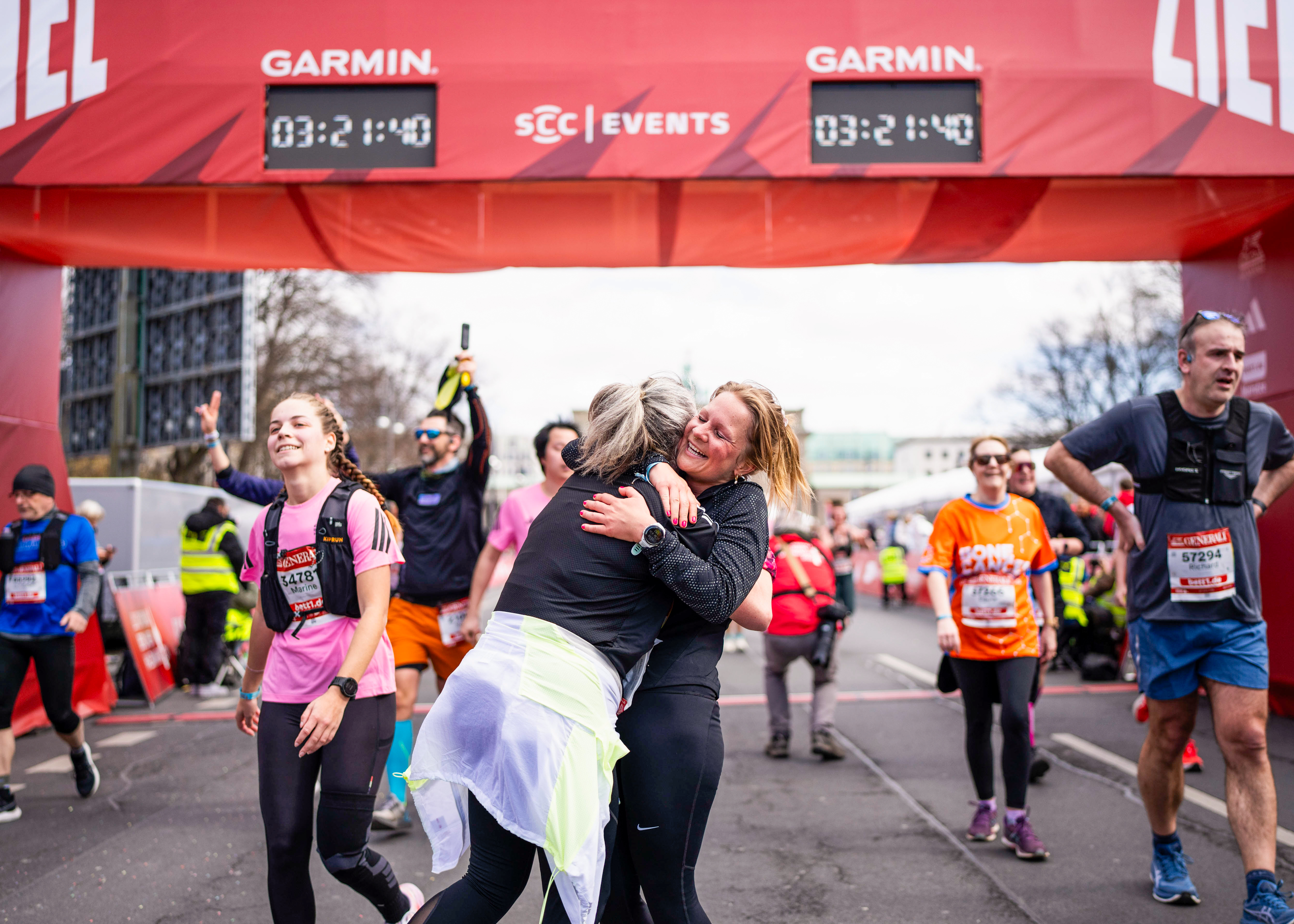 Grenzenlose Freude kurz nach dem Überqueren der Ziellinie beim GENERALI BERLINER HALBMARATHON.